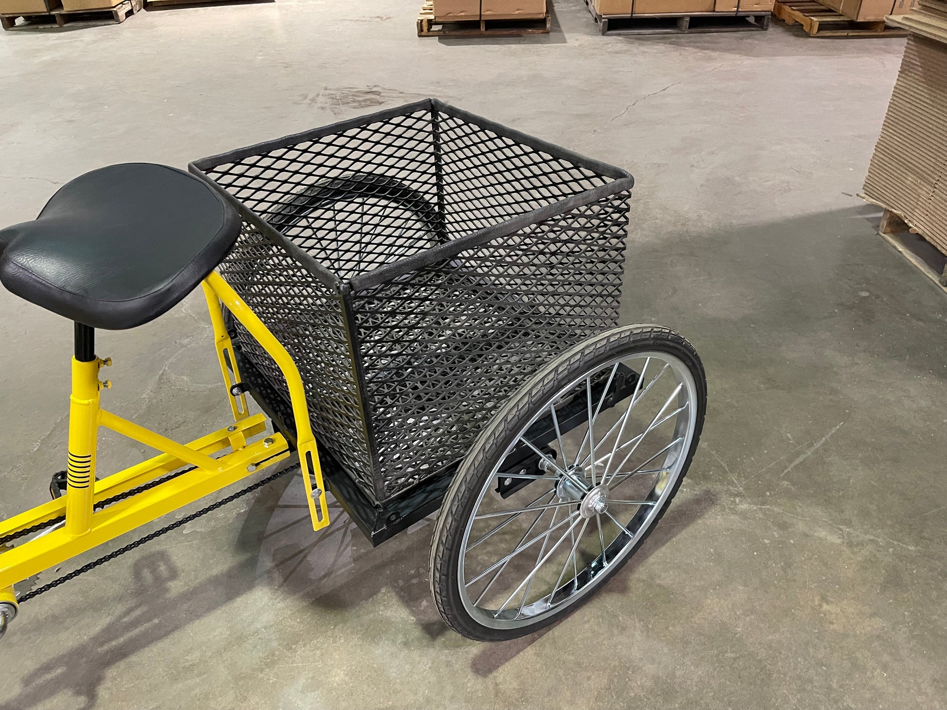 Safely transport your items while zipping around on your Trailmate 24" or 26" Hefty Hauler industrial trike with this heavy duty powder-coated steel rear basket.